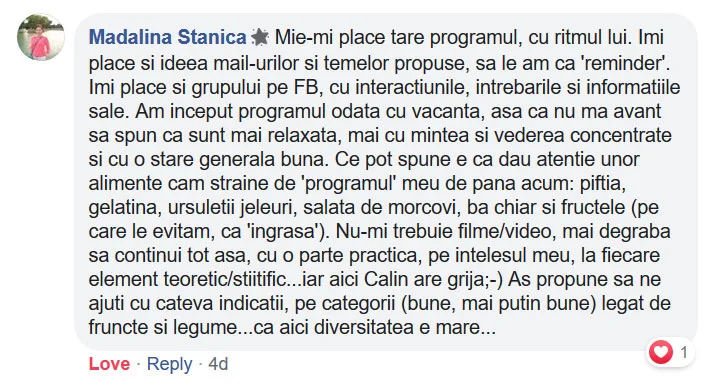 Programul NU este o consultație medicală. Nu oferim diagnostice, tratamente medicale sau un plan pentru schimbarea acestora. Participantul trebuie să discute cu personalul medical avizat dacă nu este sigur că recomandările din program se potrivesc cu problemele de sănătate pe care le are.